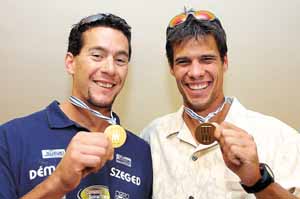 - A társa is önökkel tart a párjával? - Nem, nem szoktunk közösen nyaralni. Tavaly például mi Krétára mentünk, Tibiék meg a horvát tengerparton kötöttek ki. A napfény és a vízpart volt az egyedüli közös pont. - Egyelőre azonban még itthon van feladatuk ... - Igen, pár napig még biztosan tart majd az ünneplés. - A helyszínen volt alkalmuk bulizni egy jót? - Ilyesmire természetesen mindig szakítunk időt. Már az első döntős nap estéjén is volt egy kisebb összejövetel, hiszen a mezőny fele végzett akkorra. Egy ír kocsmában gyűltünk össze, és azt hiszem, fellendítettük egy kicsit a hely forgalmát ... Az igazi bankettre azonban vasárnap került sor, amiből szintén kivettük a részünket. Most pedig itthon folytatódik a sor, a budapesti kitérő után Tibinek Vácott vannak kötelezettségei, nekem meg előbb-utóbb Szegedre, a klubomhoz kell majd mennem. - Azt tudja már, hogy az orvosi diplomáját mikor veheti át? - Még nem, de gondolom, majd azokkal együtt, akik valamilyen oknál fogva lecsúsztak a szeptemberi időpontról. Ez persze már csak egy kisebb csoport lesz, így olyan nagy felhajtás, mint amilyen a Budapest Kongresszusi Központban volt, nem várható. De azt hiszem, bőven kárpótolt az aranyérem miatti rivaldafény ... - Kicsit sem sajnálja, hogy nem parádézhat talárban? - Higgye el, nem bántam meg, hogy kimentem a vébére. Persze az ember hajlamos úgy képzelni, hogy akkor teljes az orvosi egyetem elvégzése, ha a végén a többiekkel együtt kapja meg a jól megérdemelt diplomát, és veheti fel a doktori címet, de a spanyol szervezők nem igazán hajlottak rá, hogy miattam eltolják az evezősversenyt. - Jól megérdemeltet mondott? - A négyes osztályzat talán belefér a kategóriába ... - Tavaly számos sztorival tértek haza a versenyről. Az idén milyen csínyeket követtek el, vagy követtek el mások önökkel? - Az egyiptomiakkal ugyan megint egy szállodakomplexumban laktunk, de szerencsére jó távol egymástól, így a hajnali imádkozásaik ezúttal nem zavartak bennünket. Hogy mi milyen csínyt követtünk el? Á, most csak egymást zrikáltuk, a belső ügyeket meg nem szívesen beszélném ki ... - A döntőjük rendkívül izgalmas volt - legalábbis kívülről. Belülről hogyan élték meg? - Na végre, én is szóhoz jutok. Nem hagynak kérem érvényesülni! Ha ez így folytatódik, jövőre szétülök ... - veszi át a szót viccelődve a páros fiatalja, Pető Tibor. - Szóval, kormányosként kire kellett figyelnie? - Elsősorban a csehekre, az olaszokra és az ausztrálokra. Az előbbiekre, ugye, azért, mert a Világkupa-sorozatban egyedüliként tudtak legyőzni bennünket. Igaz, csak egyszer, Münchenben. A másik két egység meg nagyon jól húzott az elő- és középdöntőben. De hogy az előző kérdésére is válaszoljak, belülről is izgalmas volt a finálé, habár az utolsó ötszáz méteren már éreztük, hogy sikerül a címvédés. - Az olaszoktól annak ellenére tartottak, hogy a külföldi szakemberek nem tippelték őket dobogóra? - Azért Abbagnale olimpiai és világbajnokként elég sokszor bebizonyította már, hogy nem szabad félvállról venni. Most is nagy hajrát vágott ki a párjával, de szerencsére tartani tudtuk őket. Egyébként azt, hogy tartottunk volna tőlük, nem mondanám, inkább úgy fogalmaznék, hogy odafigyeltünk rájuk. - És a csehek? Tőlük nem vártak többet? - Egy világbajnoki ötödik hely nem olyan rossz eredmény. Öszszességében mégis kicsit csalódást okozott a produkciójuk, de még nagyon fiatal csapatról van szó, ráadásul teljesen más egy Világkupán, vagy a világbajnokságon evezni. - Önök sem éppen öregek. - Mindkettőnknek decemberben lesz a szülinapja, nekem a huszonkettedik, Ákosnak meg a huszonhatodik. Az athéni olimpia mindenképpen belefér még ... - Visszatérve a vb-re. A víz fölött átívelő hidakon állók drukkolását érzékelték? - Igen, nagyon jó volt hallani, valahogy különleges hangulatban teltek azok a szakaszok. - Az edzőjük, Dani Zsolt hol állt? - Az edzőket kisbusz vitte végig a pálya mellett. - Mennyire hajtották ki magukat a végén? Nem látszottak olyan fáradtnak, mint a tavalyi győzelem után. - Pedig rendesen elfáradtunk. Igaz, az eredményhirdetésre ezúttal tényleg jobban összekaptuk magunkat. Viszont a tribün előtt megint nem sikerült tiszteletkört mennünk a borulás miatt. Na, majd jövőre az is összejön ... - Az idén nincs már semmilyen meghívásuk? A szlovén Iztok Cop ezúttal nem tervez versenyt a legjobbaknak? - Nem, most nem szólt, hogy lenne ilyen versenye. Viszont Svájcba mehetnénk. Ám azt hiszem, örülünk, ha végre pihenhetünk. Ez a szezon különösen hosszúra nyúlt. Gyűjtőszenvedély Pető, Haller: a sevillai ismétlők -------------------------------------------------------------------------------- forrás: Pataki Nóra, A színes Sport 2002.09.25 -------------------------------------------------------------------------------- Megirigyelték a rokonsportág sikereit az evezősök. A kajakozók éremgyűjtő-szenvedélyét követendő példának tartja a Pető Tibor, Haller Ákos magyar evezős kettős. Ráadásul a tavalyi luzerni vb-elsőségüket a múlt héten Sevillában is megőrizték. - Egyik világbajnokságon sem volt könnyű nyerni - mondta Haller. - Idén, Sevillában is nagyon kiegyenlített volt a mezőny, az előfutamok alapján nem lehetett megjósolni, ki nyer. A magyar kettős azért bízott saját erejében, nem kevés pénzt hozva ezzel egy osztrák szurkolónak, aki fogadásokat szokott kötni Petőék győzelmére. Persze előtte kikéri a véleményüket. Igaz, most nem a legjobb előjelekkel készültek a döntőre. ![]() Nagyon aranyosak - Az előfutam után elfelejtettük az állványra kötni a hajót és a viharos szél ledöntötte. Szerencsére, sikerült a rajtra m