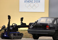 Próba Athén belvárosában: a robot a „pokolgépet” rejtô autót vizsgálja |