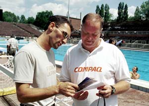 ![]() Deutsch Tamás sportminiszternek régen volt ilyen boldog sétája "Vízi stúdió" Készülnek az MTV munkatársai is. A két medence környékén 24 kamera veszi az eseményeket, három közvetítőkocsi segíti a munkát. Az MTV Sportosztályának vízilabda-szekciója a kiköltözik a Szigetre. A Sportuszodában felállított stúdióból adják az összefoglalókat. A női derbiket Mezei Dániel kommentálja az m2-es csatornán, a fiúk főműsoridőben kerülnek képernyőre az m1-n Knézy Jenő "tolmácsolásában". A boldogok sétája Tegnap délután helyszíni bejárást tartottak a vízilabda Európa-bajnokság helyszínén, a margitszigeti sportuszodában. Deutsch Tamás ifjúsági és sportminiszter, Alexandro Sansa, a LEN igazgatója, Martin György, a Magyar Vízilabda Szövetség elnöke és Fábián László, a szervezőbizottság elnöke nézték meg a munkálatokat. Az uszodán az utolsó simításokat végzik, látszik, hogy gyönyörű ékszerdoboz lesz a színhelye a 25. Európa-bajnokságnak. Deutsch Tamás elmondta, hogy régen volt ilyen boldog sétája, hiszen ez a létesítmény már most alkalmas lenne az olimpiai úszószámok lebonyolítására. Alexandro Sansa elismeréssel szólt a rendezők munkájáról, és kiemelte, hogy a politikai és a sport közös hangot talált. A bejáráson részt vett Szekeres Pál is, a mozgássérültek képviseletében. Szabó Sándor, (b. b.),(buda), A Színes Sport 2001.06.12. ![]() Koko és Kemény kapitány eszmecseréje Reméli, nem kell kisegítenie a válogatottat Vizes vizit Aligha vitás, hazánk két legnépszerűbb "sportintézménye" ma Kovács István és az olimpiai bajnok vízipóló-válogatott. Kettejük találkozóján jártunk tegnap. Koko serényen buzdította pólósainkat, hiszen pénteken kezdődik Eb-menetelésük. Amikor bunyósunk befutott, válogatottunk tréningezett. A foglalkozást felváltva Kemény Dénes és Kásás Zoltán irányította. Senkit se zavart, hogy kopácsolás, építkezés mellett kellett tréningezni. Koko a sikerkapitány édesapjával, Kemény Fecsó bácsival csevegett, majd az olimpiai bajnok dr. Molnár Tamás faggatta őt. Később megérkezett Kemény Dénes családja is, a gyerekei lelkendezve mutatkoztak be kedvencüknek, s a szombati gálabelépőjüket dedikáltatták. Az edzés végén Kemény kapitány elmondta tanítványainak, hogy Koko mindannyiukat meghívta a Chacón elleni meccsére. A fiúk ígérték, ha az első két találkozón jól szerepelnek, ott lesznek a Kisstadionban. "Szombattól én is kimegyek szurkolni - mondta Koko. - Elmehettem volna nyaralni, de nem hagyom ki az Eb-t. Remélem, jól megy majd a játék, nem kell beugranom a vízbe kisegíteni őketÖ" (buda, tamas), A Színes Sport 2001.06.13. |