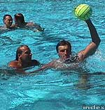 A lányok tisztában vannak az elvárásokkal Három hölgy (Rédei, Valkay és Györe) már a hivatalos edzés előtt félórával melegített, és várta, hogy vízbe szállhasson. A triumvirátusnak az volt a "bűne", hogy elmaradásuk volt az előzőnapi edzésről. Ezt az egyébként 4 x 200 métert sem lehet azonban ellógni Faragónál. Így mire a többi játékos megérkezett, ők már fujtatva szálltak ki a medencéből. Györe Lajos, a női válogatott másodedzője érdeklődésünkre elmondta, hogy a lányok nagyon várják már a kontinensviadalt, és tisztában vannak vele, hogy a döntőbe jutás a minimális elvárás. Ott pedig már bármi lehet... - A lányok mindent alárendelnek a felkészülésnek, és akik sejtik, hogy nem lesznek kerettagok, azok sem lógnak ki a sorból. Tudják, hogy az ő munkájuk is legalább olyan fontos, mint akik medencébe szállnak majd a szigeten - fűzte hozzá Györe. Eközben Faragó utánozhatatlan orgánumán adta az utasításokat a vízben sínylődő hölgyeknek. Itt is látszik már az egyenjogúság, hiszen alig tért el a férfiak munkájától az, amit a lányokkal végeztetett. Szidor, INDEX 2001.05.25. |