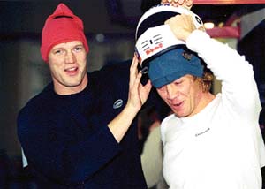 Hanem a gázpedált. Az olimpiai bajnok pólósok közül mindazok, akik nem vizsgáztak, avagy nem edzettek, szerda délután remek hangulatú, továbbá kissé benzinszagú bulin vettek részt a mogyoródi fedett gokartpályán. A válogatott egyik támogatója, a Whirlpool Magyarország Kft. által rendezett viadalon a pólósok mellett a cég csapata, valamint a média képviselői öltöttek magukra bukósisakot, hogy aztán alant, a gumifalak között kiderüljön, ki a leggyorsabb. Nos, pólósaink közül az utóbbi időben a firenzei forgalomban edződött Fodor Rajmund bizonyult a legjobbnak - igaz, a nápolyi őrületben élő Kásás Tamás, valamint a semmihez sem hasonlítható budapesti vadvilágban nap nap után helyt álló Kósz Zoltán és Vári Attila valamelyest hátrányban voltak vele szemben, minthogy nevezett urak langaléta végtagjait nem kifejezetten gokartra terveztékÉ ![]() Mégpedig padlógáz: remek hangulatú bulin nyomta a pedált néhány olimpiai bajnokunk a mogyoródi gokartpályán. Ha esetleg valaki nem ismerné fel az urat, annak eláruljuk, így fest a világ legjobb pólósa, Kásás Tamás, amikor versenyautóban ül. Köztünk legyen szólva: ebben a műfajban azért nem ő a No. 1 ![]() Schumacher is így kezdte: Fodor Rajmund, a leggyorsabban gokartozó magyar vízilabdázó ![]() Székely Bulcsú kanyar közben - fordulni azért gyorsabban szokott a meccseken ![]() Vári Attila és Märcz Tamás, avagy sapka helyett ezúttal sisak és maszk került a fejükre A színes Sport, 2000.12.28. |
