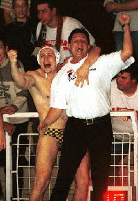A második felvonásban már nem csupán békés egymás mellett úszás szerepelt a programban. Előbb csak keményedett a meccs, utóbb kissé pankratív elemek vegyültek a játékba. Úgy mellesleg Matajsz előnygólját követően Szebeni lőhetett négyest, Pelle azonban idejében letette karjait, s lőn 3-1 helyett 2-2, a túloldalon ugyanis Szívós megtalálta a rést. Minthogy egyik csapat sem tudott elmenni kettővel, egyre vibrálóbbá vált a légkör. Nem munkált senkiben a "huh, végre van egy kis laufunk" nyugtató érzése. Miképp az "ez kicsit sok, de próbáljuk meg" sem. Állandóan ott lihegtek egymás nyakában. Márpedig ha valakinek a nyakában folyamatosan lihegnek, az előbb-utóbb felkapja a vizet. Ráadásul most a víz is kéznél volt... Azt persze sohasem fogjuk megtudni, mi történik, ha Varga Zsolt két lóba után lőhetett volna saccra öt méterről. Onnan ő ritkán téved. Csakhogy Kovács István időt kért, mondván, 3-2-es vezetésnél fő a nyugalom. Nem értékesítették az emberelőnyt. Pedig szokták. Ám a Honvéd játéka erősen hullámzott. Hiányzott belőle az alapszakasz-győzelmet hozó nyugalom. Az átgondoltság, amelynek köszönhetően a dominósok már 7-1-re vezettek négy nappal ezelőtt. Úgy fest, túlságosan megbolygatta a tudatukat, hogy a ferencvárosiak a tavalyi felzárkózásukat kopírozzák. Akkor 2-6 után indultak meg. Persze ellenük. Ráadásul, akárcsak szombaton a Kőér utcában, megint akadt egy ember a címvédőnél, akinek sült a keze. Nyéki Balázs kontrából egyenlített, előnyből is betalált, csatlakozott hozzá Székely is, így hiába vezetett háromszor a Honvéd, az utolsó negyed döntetlennel kezdődött. Szívós elhozta a labdát, megmaradt a vendégek fórja, Gombos pedig megtalálta a rövid sarkot. Erre Nyéki a túloldalon könnyű nyolcról elengedte a labdát, az meg a kapufáról bevágódott a rövid felsőbe (6-6). Ez több volt mint egyenlítés. Pelle Balázs ugyanis érezhetően elveszítette a fonalat. Jóllehet ötödször szerzett vezetést az esélyes (Szívós lenyűgöző higgadtsággal csalta át Kószt a rövid sarokra, majd pattintott a hosszúba a szélről, előnyből), Nyéki következő, blokk mellett elengedett lövésénél Pelle meg sem moccant. S minthogy a túldalon Gombos a jól bevált rövid sarok helyett a hosszúra célzott (rosszul), Tiba jóvoltából már a Fradi vezetett (8-7). Az utolsó két perc gyilkos csatát hozott. A ferencvárosiak az agresszió és a brutalitás határmezsgyéjén ellensúlyozva (az idő előrehaladtával olykor a "túlsó térfélre" tévedve) támadták le a labdát járató honvédosokat, a kezek hol a labda, hol az arc felé csapódtak, minthogy azonban ezért elég rendszertelenül sújtották őket kiállítással, érthető módon addig feszítették a húrt, ameddig lehetett. Jäger szemhéja egy "határozottabb" védőmozdulattól például felszakadt, majd visszatérését és gólját követően megint kapott egy akkorát, hogy a meccs után első útja a szemklinikára vezetett, ahol szaruhártya-repedés miatt rögtön meg is műtötték... Ekkor már semmi sem számított. Ötvennégy másodperccel a duda előtt Szebeni lövése is bevágódott Pelle kezei között (9-8), aztán a Honvéd került fórba. Kisvártatva kettősbe, Sugár megütését követően. Senki sem tudta, mi történik. A bírók egymás "lába alá" fújtak, ellentétes ítéletekkel kuszálva össze az amúgy is átláthatatlan összképet. A vereség rémétől és a feléjük kalimpáló karoktól megriadó vendégek már képtelenek voltak normális támadásszövésre. Szívós elhalt húzása után még visszakerült hozzájuk a labda, Sugár kezét viszont meglökték lövés közben, a labda elszállt, a duda megszólalt, Tibát lefejelték, Kószt megrúgták, Wiesner szakosztályvezető párbajra hívta Tóth Imrét - ezzel csengett le a meccs. Folytatás szerdán, a Kőér utcában. Nyilván nem az első vérig. A 8 pont eléréséig tartó párharc állása: 7-5 a Honvéd javára. Mestermérleg Vad Lajos: - Úgy látszik, ha ég a ház, csak akkor tudunk igazán jól, fegyelmezetten és agresszíven játszani. A csapat dicséretet érdemel, remekül küzdött, annak pedig külön örülök, hogy remekül bírjuk erővel. Kovács István: - Kihagytuk az emberelőnyöket, továbbá kapusunk a negyedik negyedben nem adott kellő támaszt a csapatnak, ezért veszítettünk. Nem kívántunk belemenni a verekedésbe, mert tavaly ezért veszítettük el a kulcsembereinket. Úgy véltem, nem kell kockáztatni és felvenni a kesztyűt. De lehet, hogy mégis muszáj lesz. CS.G., Nemzeti Sport 2001.04.24. |