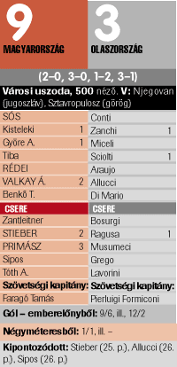 Második, első, második, első - a mester két éve alatt ily csodás ritmusban "érkeztek" a helyezések. A tavalyi, barcelonai tornán és a fukuokai vb-n ezüst-, a margitszigeti kontinensviadalon és itt aranyérem. "Megint gyengén játszottunk, igaz?" - kérdezte szokásos humorával a csapattal dolgozó Györe Lajos, majd felszállt ő is arra a gépre, amely Athénig repítette a társaságot. Megnyert, gyönyörű kupa ide vagy oda, nincs megállás: decemberben Világkupa, amelynek jegyében a görög fővárosban négy napon keresztül kétkapuzik a hölgykoszorú a haziakkal. Mindezt persze vasárnap este egy nagy buli előzte meg. Ahogy egy aranycsapathoz illik. Mestermérleg Faragó Tamás: - Nagy öröm az nekünk, hogy okosabbak voltunk az olaszoknál. Jó volt látni, hogy nem tudnak mit kezdeni velünk, máskor mosolyogni szoktak, ha velünk játszanak, ezúttal viszont mi mosolyogtunk rajtuk. Pierluigi Formiconi: - Sokkal jobbak voltak a magyarok, szinte minden sikerült nekik. |
