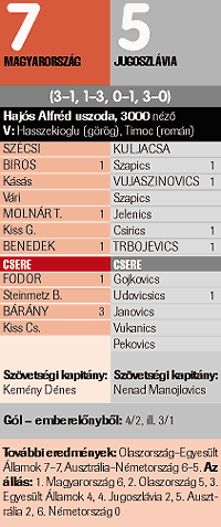 szokottnál jóval több lehetőséget Kemény Dénes. Azzal persze mindenki tisztában volt, hogy az este még véletlenül sem telhet a könnyedség jegyében - elvégre tavalyi nemezisünk, a csapatunkat az Eb-n és a vb-n is legyőző jugoszláv együttes volt soron. Ez mindenesetre másképp indult, mint a tavalyi Eb-meccs. Először is, nem zuhogott. Másodszor: négy perc alatt elmentünk hárommal. Benedek szabadult meg emberétől és tette be a labdát Kuljacsa hóna alá, majd egy Biros-Molnár kontra gyümölcsözött, utóbb Kiss Gergő passzát Bárány húzta be. Akciógól mind, a szerbek ellen - nem akármi. Csirics lövése sem akadt volna be, ha nem pattan meg a labda Kásás kezén; amikor Szapicsé egyenesen érkezett, Szécsi simán odaért, jegyezzük meg, hátrányban. Sajnos, Molnár pattintása a léc éléről kifelé jött, mindazonáltal így sem lehetett panaszunk az első hét percre (3-1). A másodikban Biros ziccere hozhatott volna megnyugvást, ám Kuljacsa jó helyre tette a kezét, majd Kiss nem kapott emberelőnyt, a jugók igen, Vujaszinovics pedig nem ismert kíméletet. Fór híján továbbra is az akciók okoztak gyönyört, Benedek egészen hihehetlen bravúrral mentett ki egy labdát két rázuhanó bekk közül, Fodor ballal elkapta, jobbal betette, ezt is ki lehet tenni a kirakatba. A túloldalon egy újabb máktól feketéllő gól tartotta képben a vendégeket: Udovicsics labdája a felső lécről vágódott Szécsi fejére, onnan pedig be. Kiss Gergő rútul kapusba kent ziccere nem hiányzott, Szapics egyenlítése még kevésbé. Első előnyünket Biros hamar ellőtte, Kuljacsa védett - na ez a negyed speciel feledhetőnek hatott (4-4). Milliméterek döntöttek a harmadik rész elején, a Szécsi által oldalra ütött labda épphogy hozzáért a kötélhez - ellentámadásunk helyett jugó szöglet, majd Trbojevics felsősarkosa következett. Keményítettek a védekezésükön a plávik, hat a hat ellen képtelenség volt helyzetbe kerülni mellettük - igaz, a mi térfelünkön sem öltött zsúrjelleget a játék. Emberelőnyünk időkérés után sem fialt, náluk a távolik elkerülték a kaput, Molnár pedig kivételesen átlövésből kísérletezett, Kuljacsa azonban szépen odanyúlt a labdára - nohát ez a negyed góltalanul pergett le nálunk: ahogy mondani szokták, írtunk már jobb papírra is (4-5).