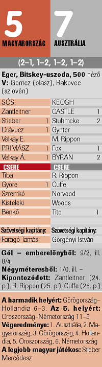 ellenakciókból egyenlítettek az ausztrálok (3-3). A fordulás után Fox találatával átvették a vezetést a Görgényi-tanítványok, sőt egy kihasználatlanul maradt magyar kettős emberelőnyt Tito büntetett góllal. Kisteleki kihagyhatatlan helyzetben a kapufára ejtett, szerencsére Primász távoli próbálkozása eredményesnek bizonyult a negyed utolsó másodpercében (4-5). A záró játékrészben újabb kettős emberelőny maradt ki Keogh kapujánál, Valkay Erzsébet vízre pattintott labdája fölészállt. Testvére is egyenlíthetett volna, ám négyméterese a kapufán csattant. Óriási izgalmak közepette remekül védekezett a magyar csapat, de a támadásoknál elpártolt a lányoktól a szerencse. Szinte szétforgácsolták a kapufát, bezzeg a másik oldalon Melissa Byran nem panaszkodhatott Fortunára, előbb rövid sarkos lövése akadt meg Sós hálójában, majd egy bátortalan kísérlete a védőkön irányt változtatva bepattant a kapuba, eldöntve ezzel a kupa sorsát.