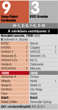 Alighanem mindent elmondtunk. Mestermérleg Kásás Zoltán: – A védekezésünk volt a döntő. Különösen a második félidőben voltak a blokkok és Kósz Zoli szinkronban. Támadásban még akadt egy-két hiba, de összességében elégedett voltam a csapattal. Gerendás György: – Lassan tradíció, hogy egy ilyen meccs előtt felvetődik a kérdés: melyik arcát mutatja a BVSC. Nos, most annyit mutatott, amennyit a Vasas engedett neki. Hihetetlenül jól felkészített, tökéletesen játszó csapattal találkoztunk, s bár nem ment nekünk rosszul, ma ennyire tellett. De ez nem baj, jól jön egy ilyen meccs, hogy tisztában legyünk azzal: mennyit kell javulnunk, hogy tavasszal megverhessük a Vasast. |
