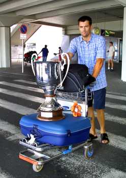 Madaras Norbert bevérzett szemmel, fáradtan érkezett, de nincs komolyabb baja, nem kell orvoshoz mennie. – Az edzéseket már mindenki unta, de a meccseken mégis hoztuk a maximumot – mondta Kásás Tamás. A hatalmas kupát Varga Tamás vihette haza. Külön kocsival, mert a család és a csomagok nem fértek el. – Megkértem Benedek Tibit, a csapatkapitányt, hogy én őrizhessem a kupát – mondta Varga. – Mindenki beleegyezett, úgyhogy nem engedem ki a kezeim közül. A csapat nem teljes létszámban érkezett haza, Molnár Tamás Amerikában tölti kéthetes pihenőjét. |
