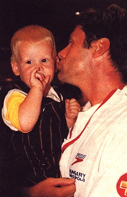 - Egyszer te is bajnok leszel! - talán ezt súgja Kósz Zoltán, a csodakapus kisfiának, akivel együtt hallgatják a Himnuszt a repülőtéren.