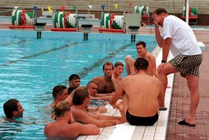 Úsztak, aztán utaztak Kemény Dénes és stábja három nap szünet után, az elutazás előtt kiadós úszótréninget vezényelt a Margitszigeten. A múlt heti bilbaói torna óta pihenek a játékosok, pihent maga a kapitány is (még a telefonját is átirányíttatta), hogy aztán csütörtök délelőtt újra összejöjjenek. Huzamos ideig, három hétig, a világbajnokság végéig. "Bilbaóban nagyon jól éreztük magunkat, és várhatóan a szöuli és a fukuokai tartózkodás alkalmával is könnyebb dolgunk lesz"-utalt a rögtönzött sajtótájékoztatón kissé morózusan Kemény Dénes a válogatottat körülvevő helyzetre, mind a médiát, mind a szurkolókat, szakembereket beleértve, akik kétségkívül mindent tudni akarnak a történésekről. Rengetegen kíváncsiak a csapatra (az elutazás előtti tréningen is több tucat érdeklődő jelent meg), az Eb ideje alatt is minden Kásásról, Molnárról, Kószról és a többiekről szólt, ahogy természetes. Ez ellen nehéz mit tenni - ha kell egyáltalán... Persze az kétségtelen, a kapitány és játékosai nincsenek könnyű helyzetben, sokszor egy perc nyugtuk sincs, de hátilyen a sztárok - a szép az, hogy a jelzőben semmi túlzás sincs! - élete. "Akkor viszont már baj van, amikor a munka rovására megy ez az egész" -mondta Kemény, amivel viszont nem lehet vitatkozni. Mint ahogy azzal sem, hogy Eb-bronz ide vagy oda, a világbajnokság egyik esélyese a magyar válogatott. Különösen annak tudatában, hogy a kontinensviadal óta eltelt kevés időben felfelé ível klasszisaink formája, a spanyolországi produkció no meg az úszótesztek arra engednek következtetni, Fukuokában szép napok, győzelmek követik egymást. "Ha a fiúk tudásuk nyolcvan százalékát képesek lesznek kihozni magukból, akkor nagyobb baj már nem lehet"-ecsetelte a mester, aki nem győzte hangsúlyozni, egyelőre az első, a kazahok elleni meccsel foglalkozik, nem tekint annyira előre, mint esetleg mások. Hétfőig Szöulban akklimatizálódik a gárda (csütörtökön negyed hatkor frankfurti csatlakozással vette Dél-Korea felé az irányt a küldöttség -a női együttes majd csak vasárnap utazik), ahol a helyi válogatott ellen végzi majd el az utolsó simításokat. A felvetésre, miszerint pluszmotivációt jelentene az a tény, hogy a csapatnak csupán a vb-arany hiányzik a kollekcióból, a "talán nem is ez, hanem az, hogy a vébét követően sokáig nem lesz komoly esemény"válasz érkezett Kemény Dénestől, akinek feszültsége mindazonáltal érthető. Amióta ő a kapitány, mindig mindenhol dobogóra állhatott a válogatott, s ezt a hagyományt most sem akarja megszakítani. Sőt nyugodtan kijelenthetjük, az előző világbajnoki produkciót feltétlenül túl akarja szárnyalni. Három éve Perthben második lett az együttes... Reptéri torta Benedeknek Az ünnepelt sem kapott kegyelmet. Ott úszott a többiekkel, egy, két, tíz, száz hossz, a kívülálló már a látványba is beleborzongott. Ők viszont bírták, szakadatlanul mentek előre. Benedek Tibor (aki a vb-k történetében a második legtöbb magyar gólt dobta, a maga negyven találatával tizeneggyel van lemaradva az élen álló Faragó Tamástól) is. Ő volt az ünnepelt. Olimpiai bajnokunk ugyanis csütörtökön ünnepelte 29. születésnapját. Egy olyan napon, amikor délelőtt úszás úszás, délután pedig utazás utazás hátán... "Van ilyen" - kacsintott a Roma csapatát a Pro Recco együttesére váltó balkezes fenomén, akin nyoma sem volt a másfél órás tréning után a fáradságnak. Persze mindig is csodálták a fizikai állapotát (mint ahogy a csuklószorítós kezét...), ami a világbajnokságon is kamatozhat majd. Aztán ha Japánban minden valóra válik, akkor kezdődik majd csak az igazi ünneplés. Úgyhogy szülinapi buli egyelőre elhalasztva. A torta ettől függetlenül járt: a pólós óriási meglepetésére Ferihegyen, a beszállás előtt a malévosok megvendégelték a csapatot egy üdítőre, és ajándékként egy nagy tortát adtak át neki. Egy szál gyertya díszelget raja -naná, hogy a leleményesebbje már mondta is: "Tibi, látod, már csak egy kell a harminchoz..." Amler Zoltán, Nemzeti Sport 2001.07.13. Fukuokában megmutathatják a pólósokAranypótlás Kevésbé népszerű futballcsapatok edzésein nincs annyi néző, mint a pólósokén. Igaz, a hódolók egy része tollal, fényképezőgéppel, tévékamerával szerelkezett fel. Úgymond hivatalból nézik a vb előtti utolsó hazai edzést. Van is mit nézni, jól meghajtja Benedekéket Kemény kapitány. A medence szélén ülő lányok a bennfentesek titokzatos mosolyával figyelik a gyakorlást. Nagy titkok tudói lehetnek, egykedvűen figyelik a sajtóhad ostromát. Az uszodai gyerekek azonban őszinte lelkesedéssel fogják a tollat, és a játékosokról készült posztert, s várják az edzés végét, s azt, hogy a habokból kiemelkedő félistenek aláírják a képeket. A kapitány kevesebb lelkesedéssel, kötelességtudóan áll a sajtó rendelkezésére. Mint mondja, túl sok időt rabol el a játékosoktól ez a megnövekedett érdeklődés. ![]() Az utolsó hazai tanácsokat osztogatja Kemény kapitány - A fukuokai vb-rajt előtt öt napot Szöulban töltünk, ahol fizikailag, szellemileg regenerálódhat a gárda - mondja a kapitány. - Nem kell az Eb eseményeivel törődnünk, sem azzal, hogy milyen a jugoszláv gárda, a csoportmérkőzésekre - Kazahsztán, Görögország, Németország - koncentrálunk. A magyar csapat - a hazai pályán szerzett Eb-bronz-érem ellenére - a vb egyik favoritja. S ha tudásának, felkészültségének megfelelően játszik, akkor aligha lehet túl nagy baj. Nem beszélve arról, hogy a Kemény-csapat az elmúlt években szinte mindent megnyert, amit csak lehetett, egyedül a vb-arany hiányzik a tarsolyból. Itt az idő a kollekció pótlására. jánosy,